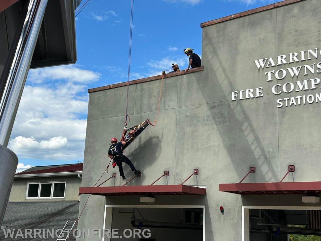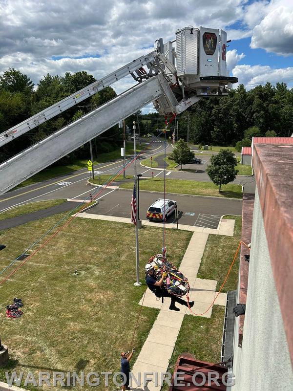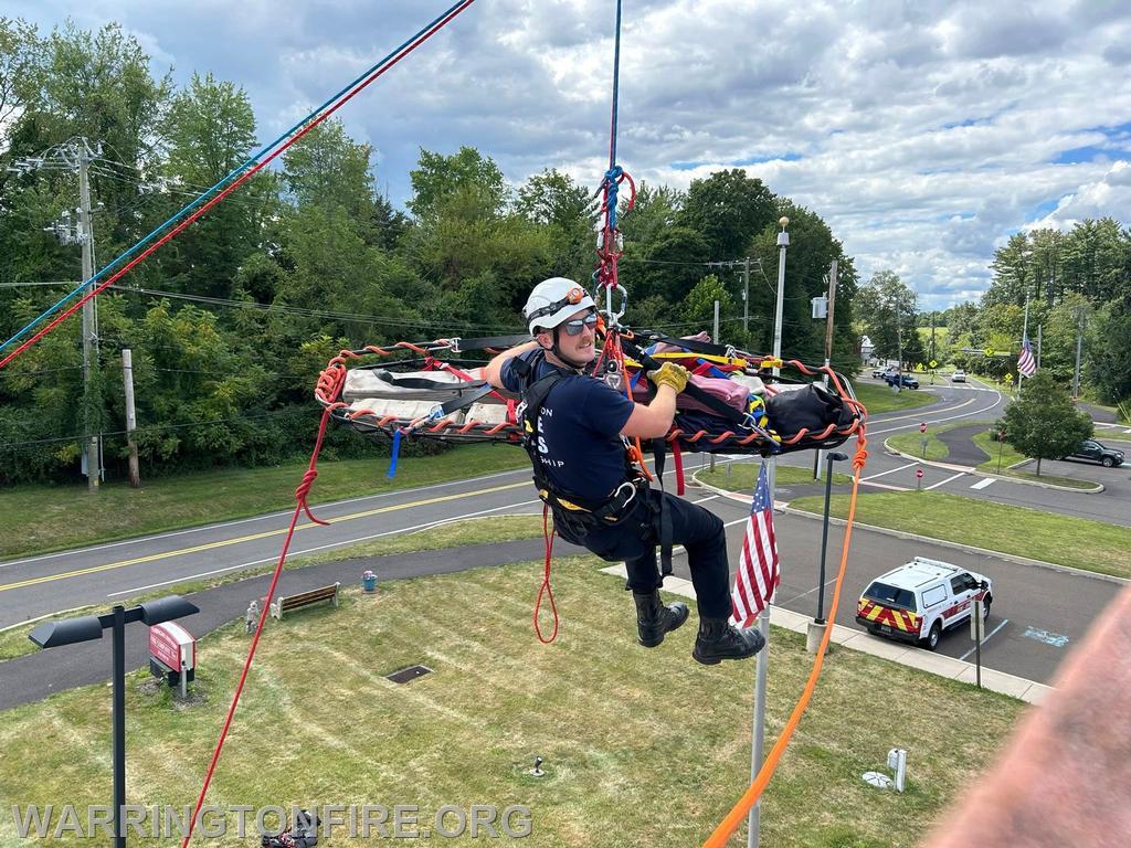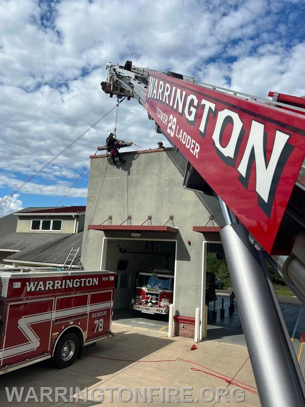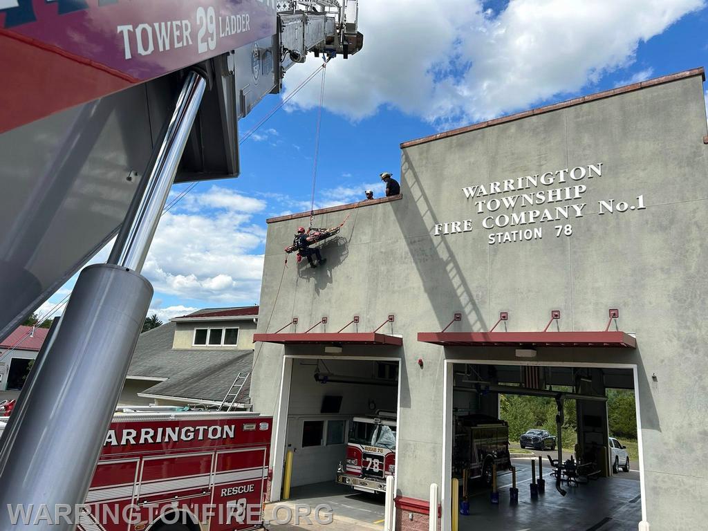 Training Tuesday! Career staff took advantage of the beautiful weather to get out and do some training. The morning consisted of one of the part time Firefighter/EMT’s getting signed off with their driver training on Tower 29. The afternoon involved rope rescue evolutions, removing a victim in a stokes basket from an elevated position. Using Tower 29 as a high point rescuers lowered the victim and a basket attendant down from the elevated height to the ground, before being hauled back up.